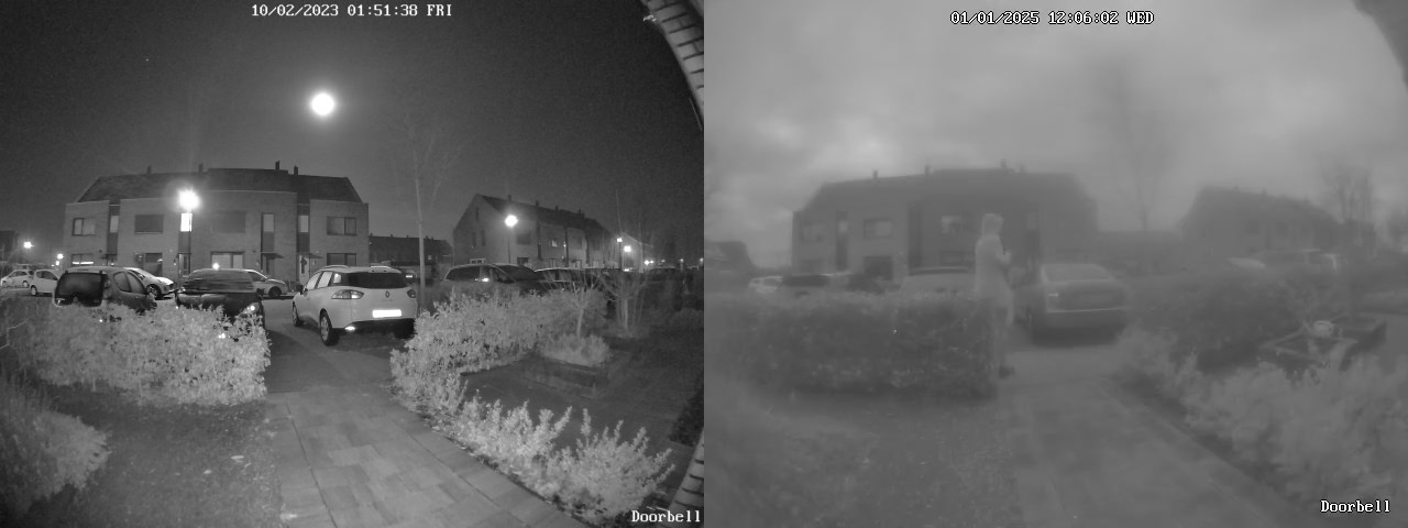 Mocht je bij die onderste vergelijking opvallen dat het om 12:06 in de middag is en waarom dan nog steeds infrarood? Omdat de detectie van genoeg licht blijkbaar (ook) niet meer goed werkt. De Reolink Video Doorbell WiFi denkt nu dat het permanent donker is. Niet dat het beeld daar beter door wordt. #sarcasme